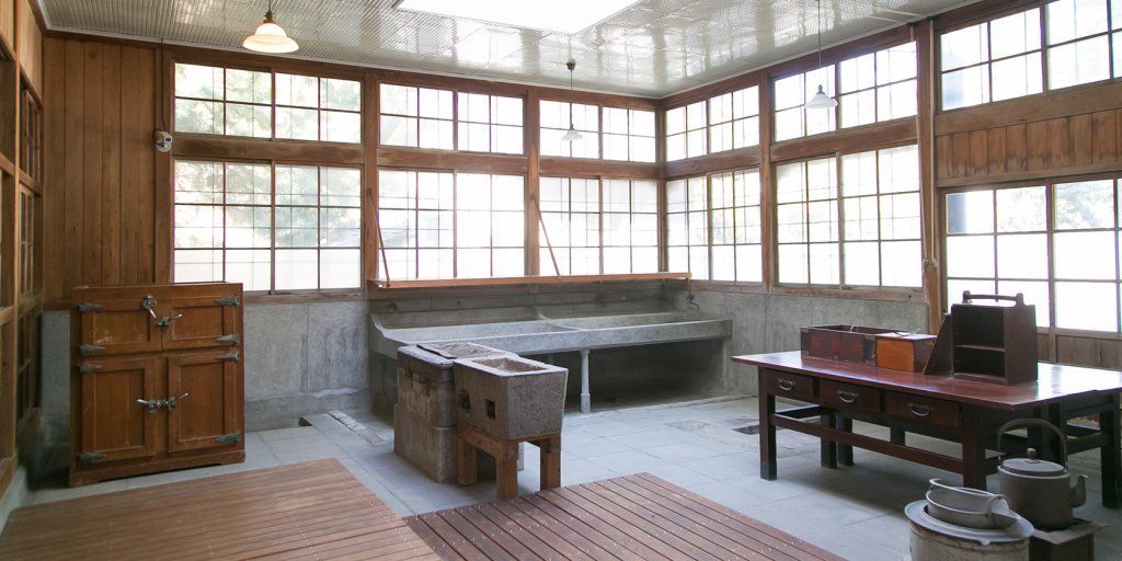 実はガラスが二重になっている調理室。この場所では火をおこさない木造ならではの工夫。天井のタイルも当時手作業で貼り付けたそう。